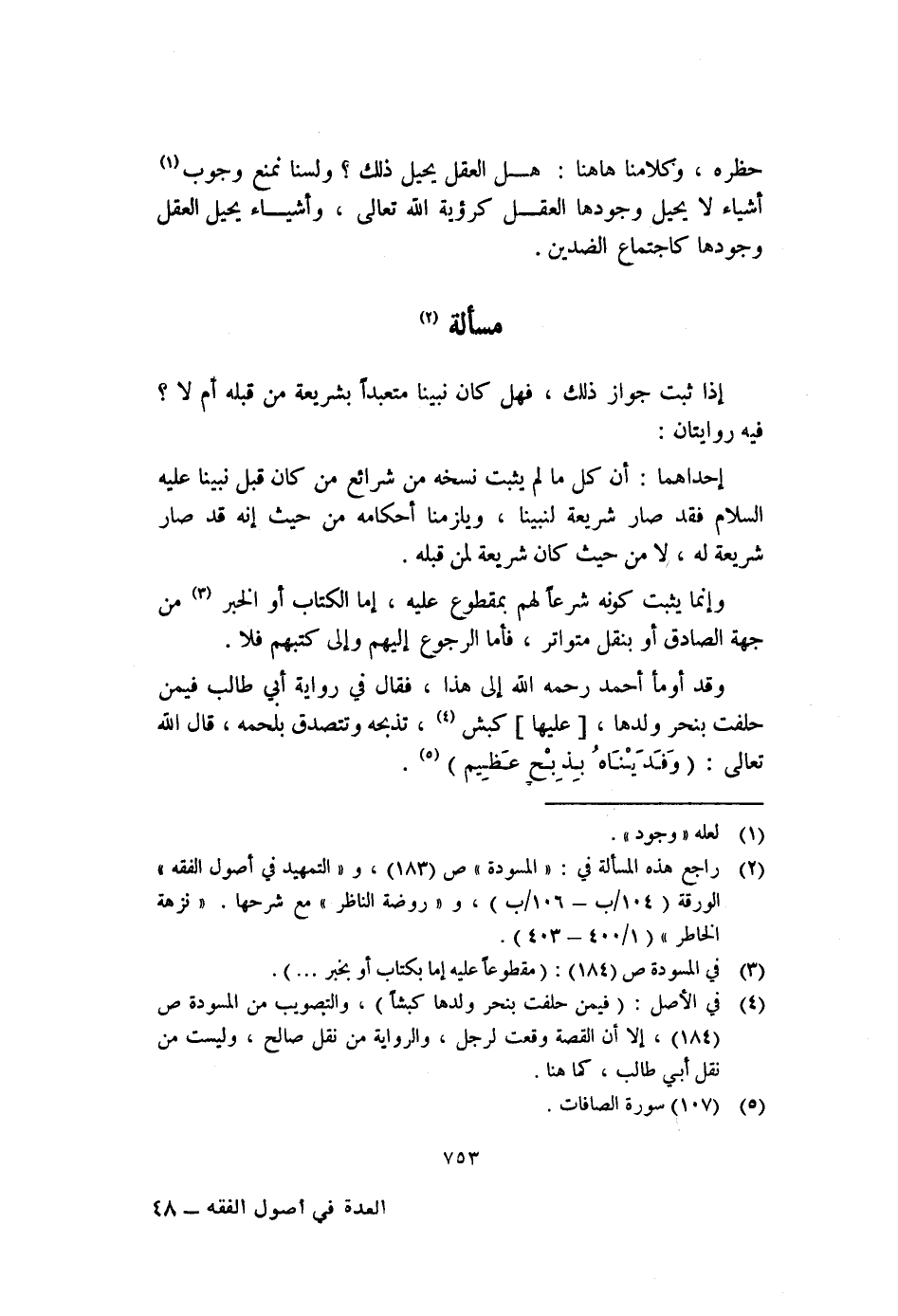(٢) راجع هذه المسألة في: "المسودة" ص (١٨٣) ، و"التمهيد في أصول الفقه" الورقة (١٠٤/ب-١٠٦/ب) ، و"روضة الناظر" مع شرحها. "نزهة الخاطر" (١/٤٠٠-٤٠٣) .