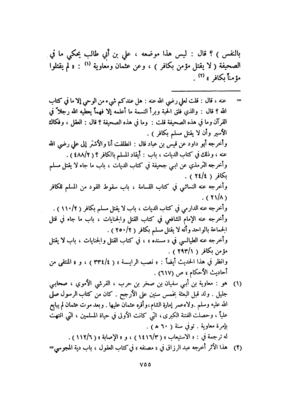 بالنفس) ؟ قال: ليس هذا موضعه، علي بن أبي طالب يحكي ما في الصحيفة (لا يقتل مؤمن بكافر) ، وعن عثمان ومعاوية (١) : "لم يقتلوا مؤمناً بكافر" (٢) .