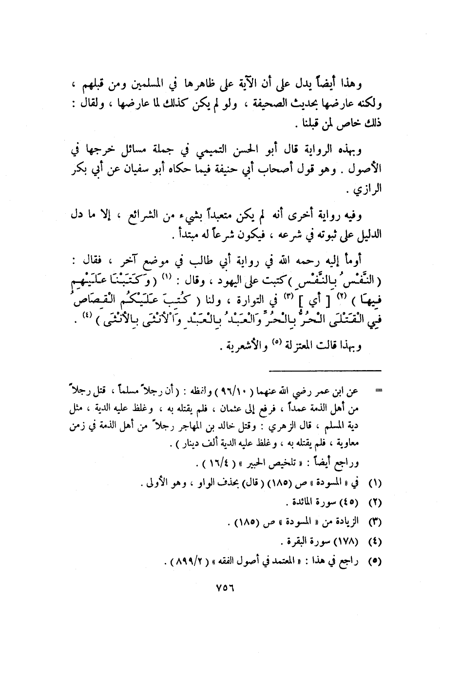 أومأ إليه رحمه الله في رواية أبي طالب في موضع آخر، فقال: (النفْسُ بالنفْسِ) كتبت على اليهود، وقال: (١) (وَكتبنا عليهمِ فِيهَا) (٢) َ [أي] (٣) في التوراة، ولنا (كُتِبَ عَليْكُم الْقِصَاصُ فِي الْقَتْلَى الحُر بِالحر وَالعبْدُ بالعبد وَاْلأنْثَى بالأنْثَى) (٤) .