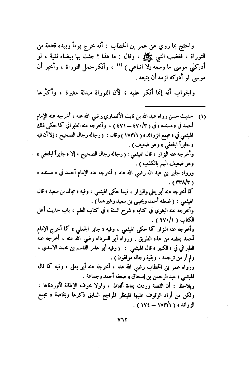 واحتج بما روي عن عمر بن الخطاب: أنه خرج يوماً وبريده قطعة من التوراة، فغضب النبي - صلى الله عليه وسلم -، وقال: ما هذا؟ جئت بها بيضاء نقية، لو أدركني موسى ما وسعه إلا اتباعي) (١) ، وأنكر حمل التوراة، وأخبر أن موسى لو أدركه لزمه أن يتبعه.