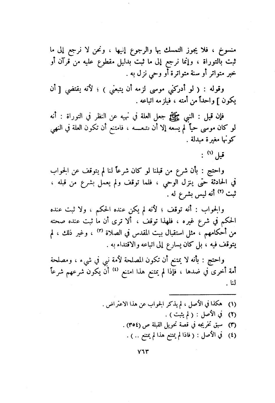 فإن قيل: النبي - صلى الله عليه وسلم - جعل العلة في نهيه عن النظر في التوراة: أنه لو كان موسى حيا لم يسعه إلا أن يتبعه، فامتنع أن تكون العلة في النهي كونها مغيرة مبدلة.