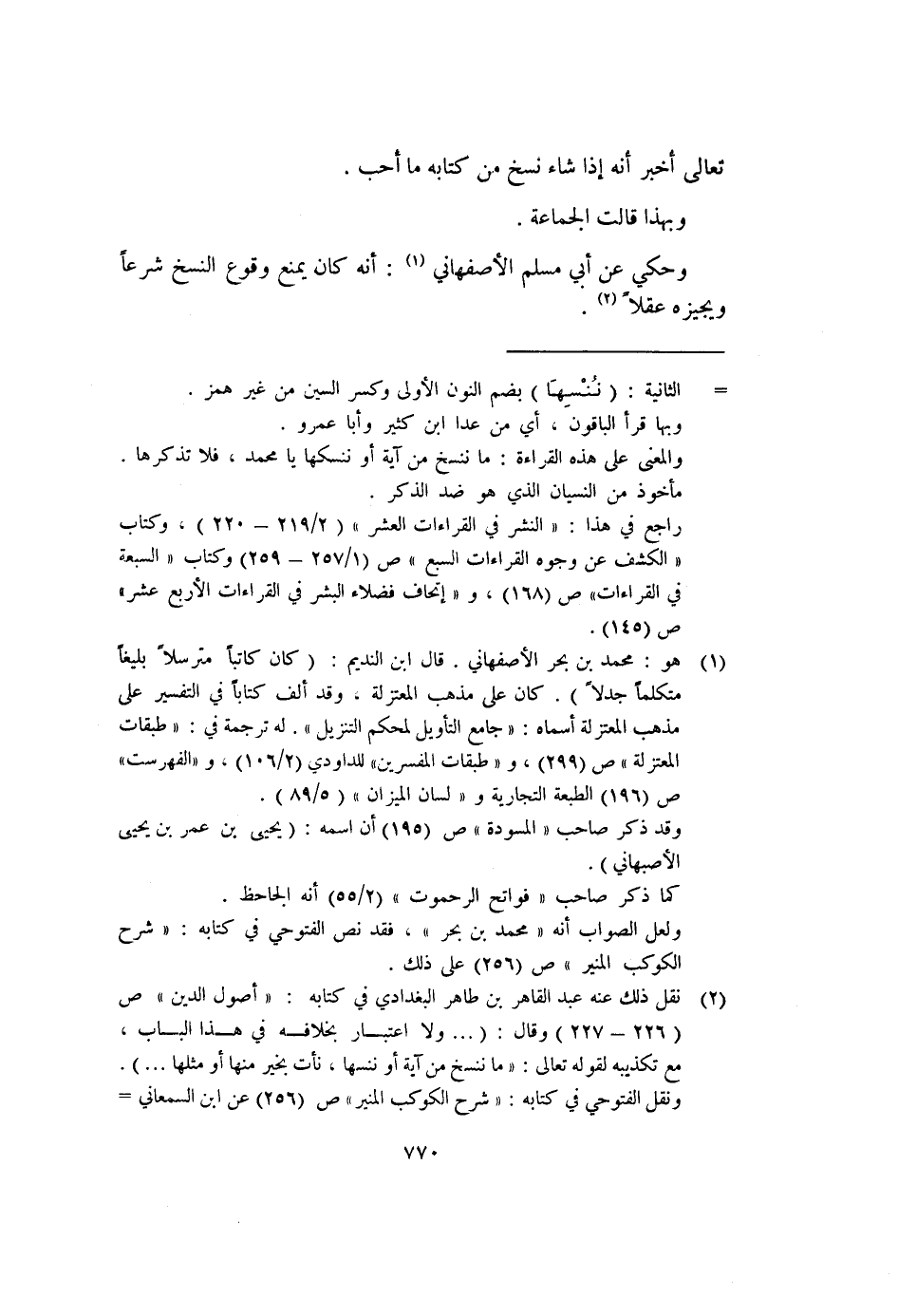(٢) نقل ذلك عنه عبد القاهر بن طاهر البغدادي في كتابه: "أصول الدين" ص (٢٢٦-٢٢٧) وقال: ( ... ولا اعتبار بخلافه في هذا الباب، مع تكذيبه لقوله تعالى: "ما ننسخ من آية أو ننسها، نأت بخير منها أو مثلها ... ) .