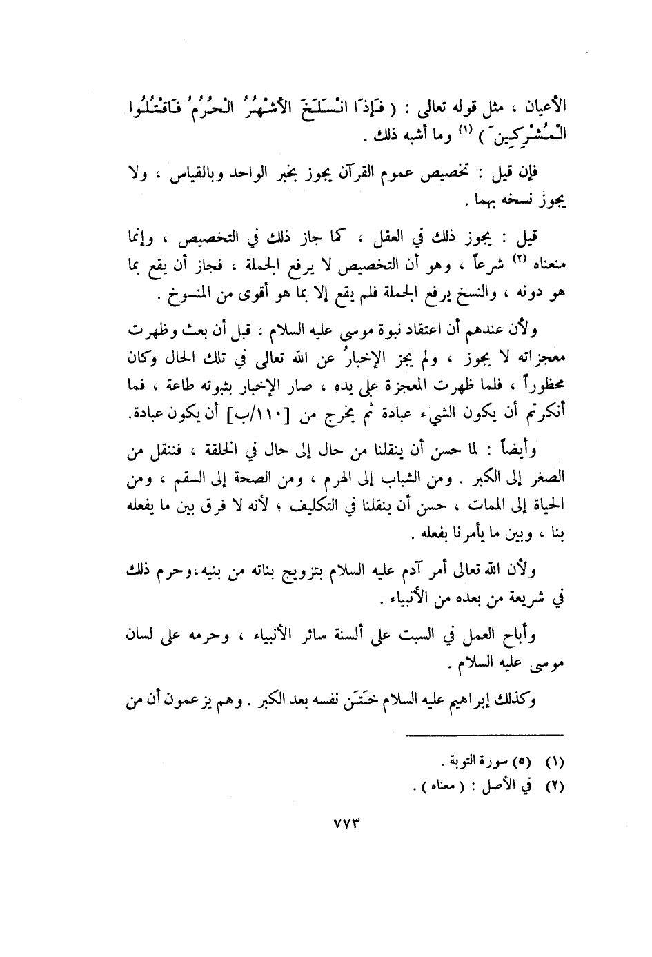 ولأن عندهم أن اعتقاد نبوة موسى عليه السلام، قبل أن بعث وظهرت معجزاته لا يجوز، ولم يجز الإخبارُ عن الله تعالى في تلك الحال وكان محظوراً، فلما ظهرت المعجزة على يده، صار الإخبار بثبوته طاعة، فما أنكرتم أن يكون الشيء عبادة ثم يخرج من [١١٠/ب] أن يكون عبادة.
