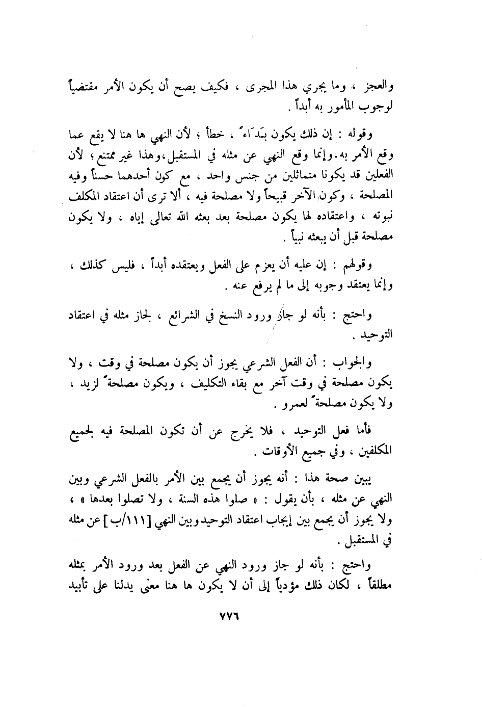 يبين صحة هذا: أنه لايجوز أن يجمع بين الأمر بالفعل الشرعي وبين النهي عن مثله، بأن يقول: "صلوا هذه السنة، ولا تصلوا بعدها"، ولا يجوز أن يجمع بين إيجاب اعتقاد التوحيد وبين النهي [١١١/ب] عن مثله في المستقبل.