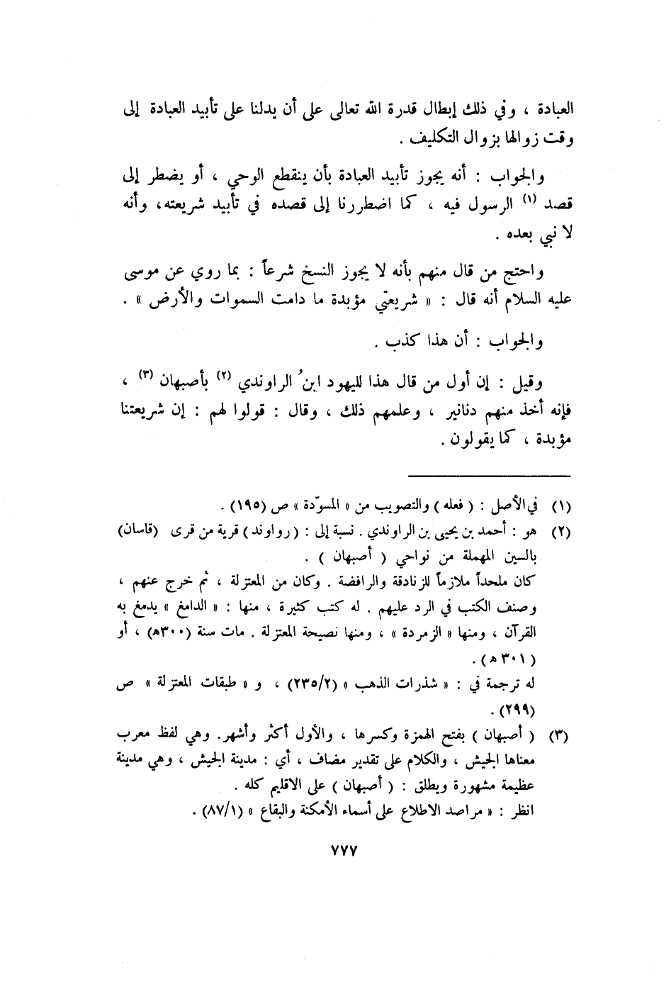 وقيل: إن أول من قال هذا لليهود ابنُ الراوندي (٢) بأصبهان (٣) ، فإنه أخذ منهم دنانير، وعلمهم ذلك، وقال: قولوا لهم: إن شريعتنا مؤبدة، كما يقولون.