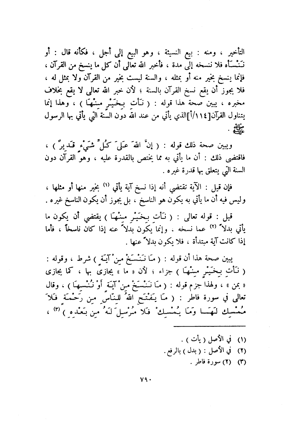 يبين صحة هذا أن قوله: (مَا نَنْسَخْ مِنْ آيَةِ) شرط، وقوله: (نَأتِ بِخَيْرٍ منْهَا) جزاء، لأن "ما" يجازى بها، كما يجازى "بمن"، ولهذا جزم قوله: (ما نَنْسَخْ مِنْ آيَة أَوْ نُنْسِهَا) ، وقال تعالى في سورة فاطر: (مَا يَفْتَح اللهُ للِنّاس مِن رَحْمَة فَلاَ مُمْسِك لَهَا وَمَا يُمسك فلا مُرْسِلَ لَهُ مِن بَعْدِهِ) (٣) ،