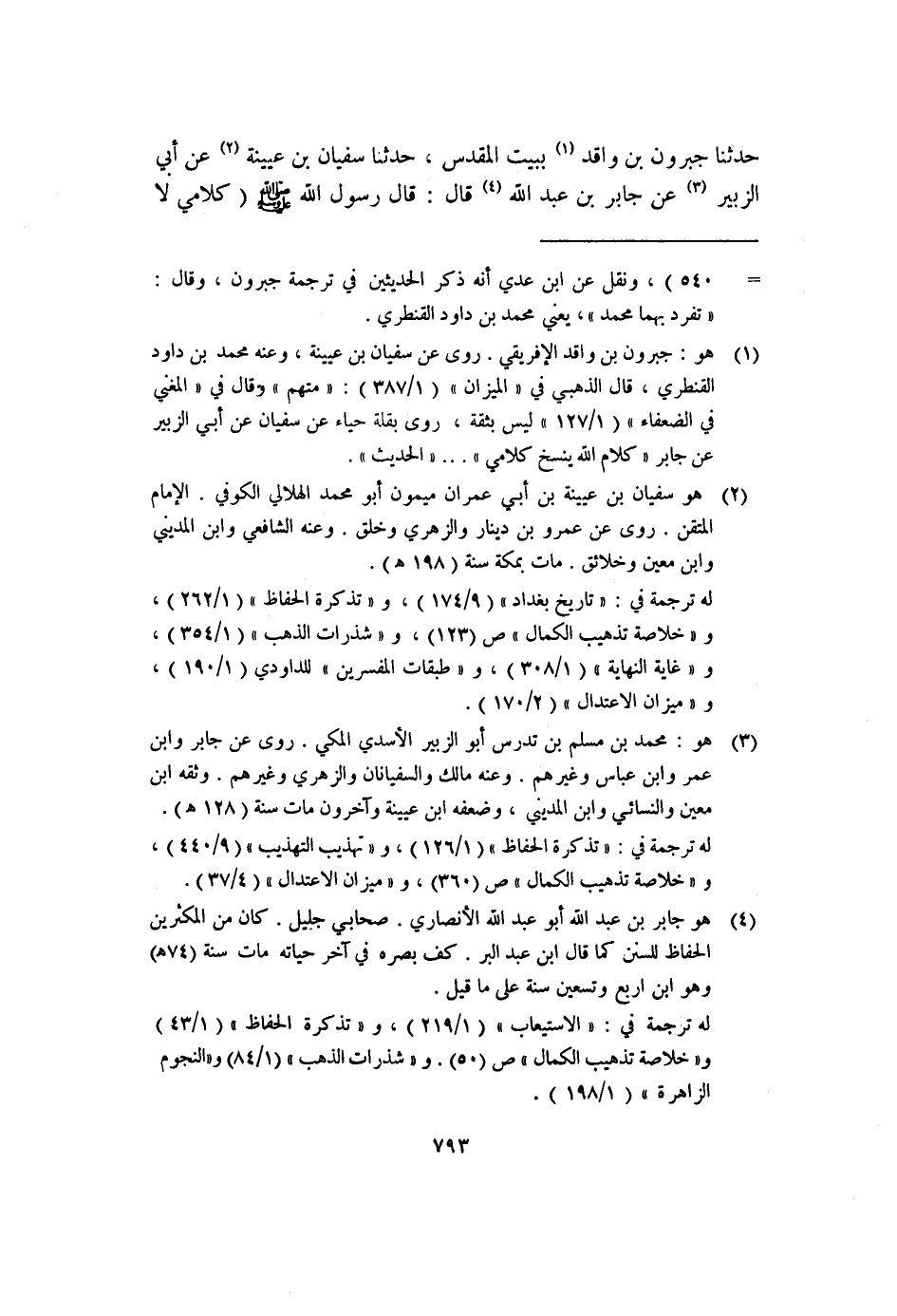 حدثنا جبرون بن واقد (١) ببيت المقدس، حدثنا سفيان بن عيينة (٢) عن أبي الزبير (٣) عن جابر بن عبد الله (٤) قال: قال رسول الله - صلى الله عليه وسلم - (كلامي لا