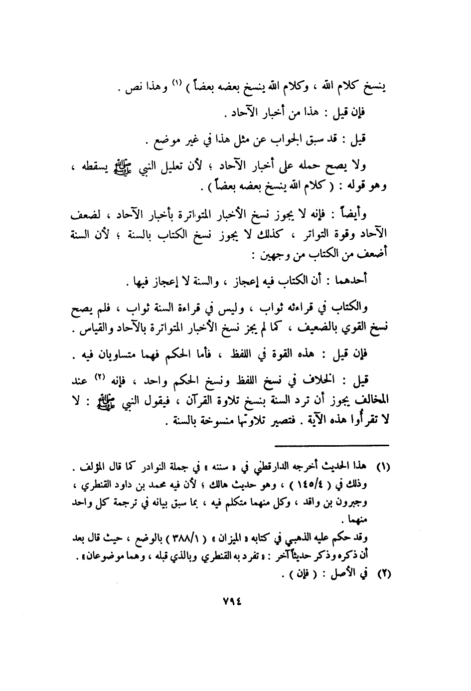 وأيضا: فإنه لا يجوز نسخ الأخبار المتواترة بأخبار الآحاد، لضعف الآحاد وقوة التواتر، كذلك لا يجوز نسخ الكتاب بالسنة، لأن السنة أضعف من الكتاب من وجهين: