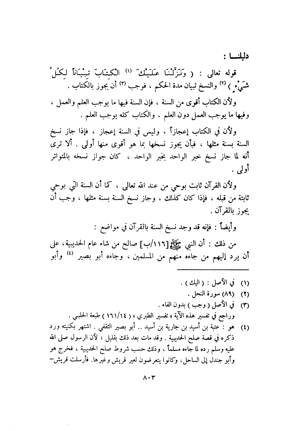 قوله تعالى: (وَنَزَّلْنَا علَيْكَ (١) الْكِتَابَ تِبْيَاناً لِكلِّ شَيْء) (٢) والنسخ تبيان مدة الحكم، فوجب (٣) أن يجوز بالكتاب.