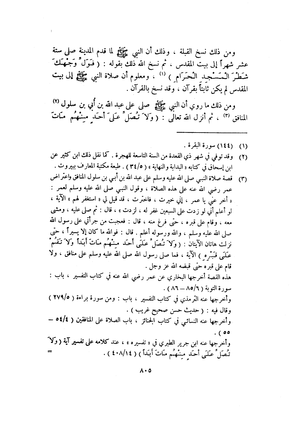 (٣) قصة صلاة النبي صلى الله عليه وسلم على عبد الله بن أبي بن سلول المنافق واعتراض عمر رضي الله عنه على هذه الصلاة، وقول النبي صلى الله عليه وسلم لعمر: "أخر عني يا عمر، إني خيرت، فاخترت، قد قيل لي "استغفر لهم" الآية، لو أعلم أني لو زدت على السبعين غفر له، لزدت"، قال: ثم صلى عليه، ومشى معه، وقام على قبره، حتى فرغ منه، قال: فعجبت من جرأتي على رسول الله صلى الله عليه وسلم، والله ورسوله أعلم. قال: فوالله ما كان إلا يسيراً، حتى نزلت هاتان الآيتان: (وَلاَ تُصَلِّ عَلَى أَحَدٍ مِنْهُم مَاتَ أبَداً وَلاَ تَقُمْ عَلَى قبرِهِ) الآية، فما صلى رسول الله صلى الله عليه وسلم على منافق، ولا قام على قبره حتى قبضه الله عز وجل.