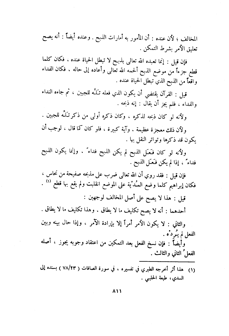 قيل: القرآن يقتضي أن يكون الذى فعله تلَّه للجبين، ثم جاءه النداء والفداء، فلم يجز أن يقال: إنه ذبحه.