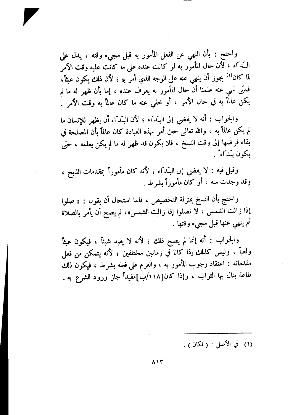 واحتج: بأن النهي عن الفعل المأمور به قبل مجيء وقته، يدل على البداء؛ لأن حال المأمور به لو كانت عنده على ما كانت عليه وقت الأمر لما كان (١) يجوز أن ينهي عنه على الوجه الذي أمر به؛ لأن ذلك يكون عبثاً، فمتى نهي عنه علمنا أن حال المأمور به يعرف عنده، إما بأن ظهر له ما لم يكن عالماً به في حال الأمر، أو خفي عنه ما كان عالماً به وقت الأمر.