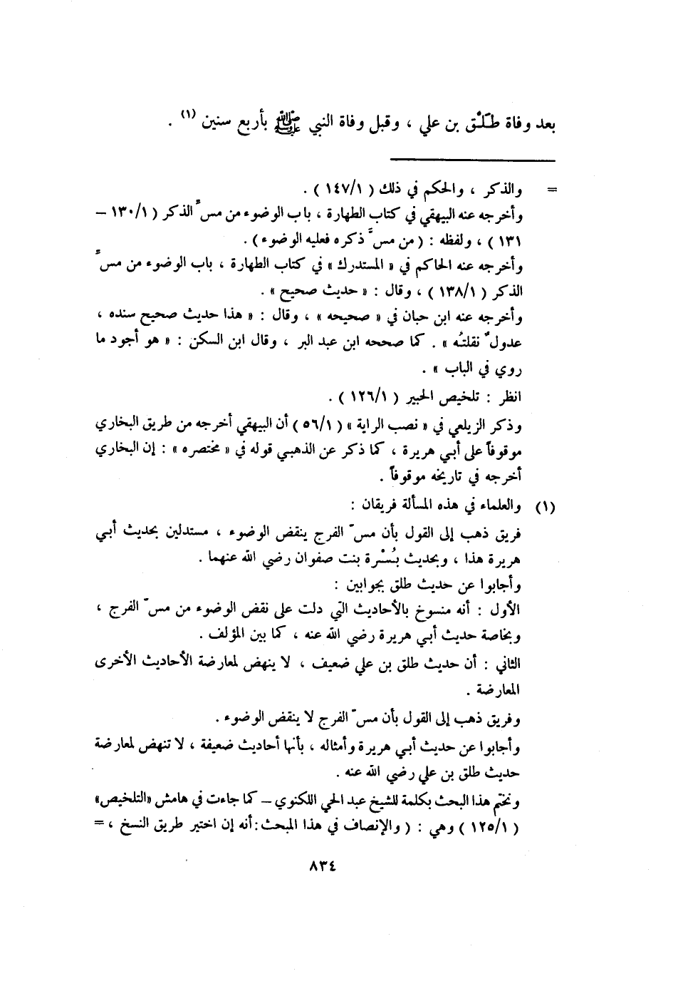 الأول: أنه منسوخ بالأحاديث التي دلت على نقض الوضوء من مس الفرج، وبخاصة حديث أبي هريرة رضي الله عنه، كما بين المؤلف.