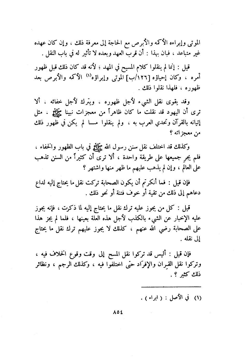 فإن قيل: أليس قد تركوا نقل المسح إلا وقت وقوع الخلاف فيه، وتركوا نقل القِران والإفرَاد حتى اختلفوا فيه، وكذلك الرجم، ونظائر ذلك كثير؟.