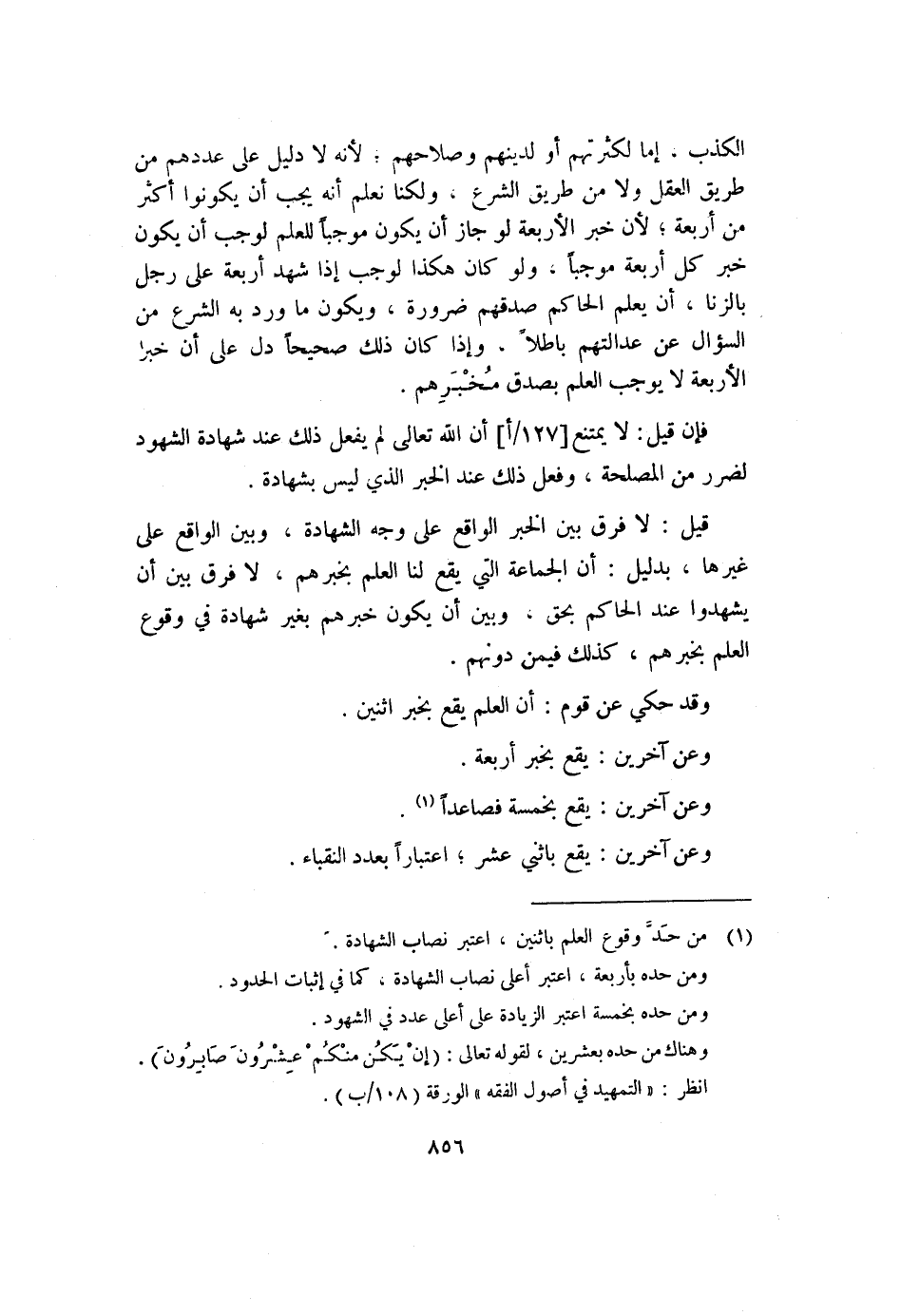 الكذب، إما لكثرتهم أو لدينهم وصلاحهم؛ لأنه لا دليل على عددهم من طريق العقل ولا من طريق الشرع، ولكنا نعلم أنه يجب أن يكونوا أكثر من أربعة؛ لأن خبر الأربعة لو جاز أن يكون موجباً للعلم لوجب أن يكون خبر كل أربعة كل موجباً ولو كان هكذا لوجب إذا شهد أربعة على رجل بالزنا، أن يعلم الحاكم صدقهم ضرورة، ويكون ما ورد به الشرع من السؤال عن عدالتهم باطلاً، وإذا كان ذلك صحيحاً دل على أن خبر الأربعة لا يوجب العلم بصدق مُخبرِهم.