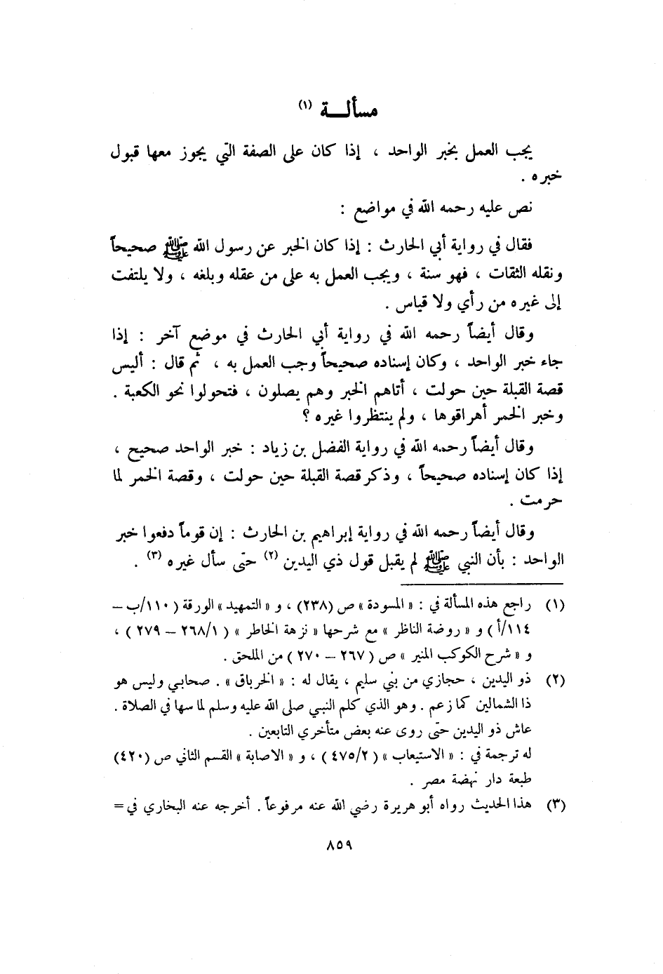 وقال أيضاً رحمه الله في رواية إبراهيم بن الحارث: إن قوماً دفعوا خبر الواحد: بأن النبي - صلى الله عليه وسلم - لم يقبل قول ذي اليدين (٢) حتى سأل غيره (٣) .
