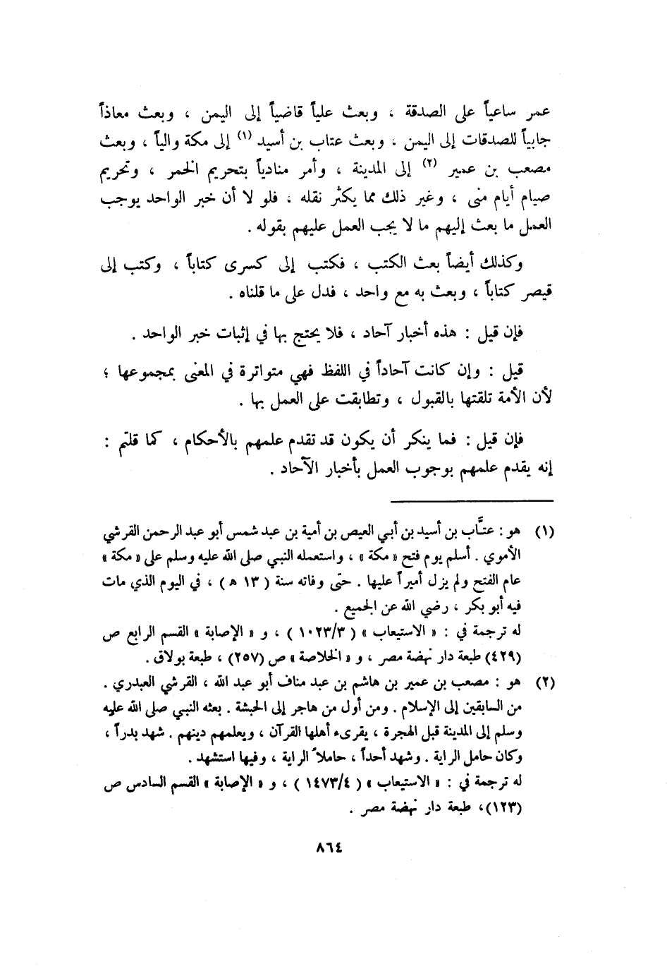 عمر ساعياً على الصدقة، وبعث عليا قاضياً إلى اليمن، وبعث. معاذاً جابياً للصدقات إلى اليمن، وبعث عتاب بن أسيد (١) إلى مكة والياً، وبعث مصعب بن عمير (٢) إلى المدينة، وأمر منادياً بتحريم الخمر، وتحريم صيام أيام منى، وغير ذلك مما يكثر نقله، فلولا أن خبر الواحد يوجب العمل ما بعث إليهم ما لا يجب العمل عليهم بقوله.