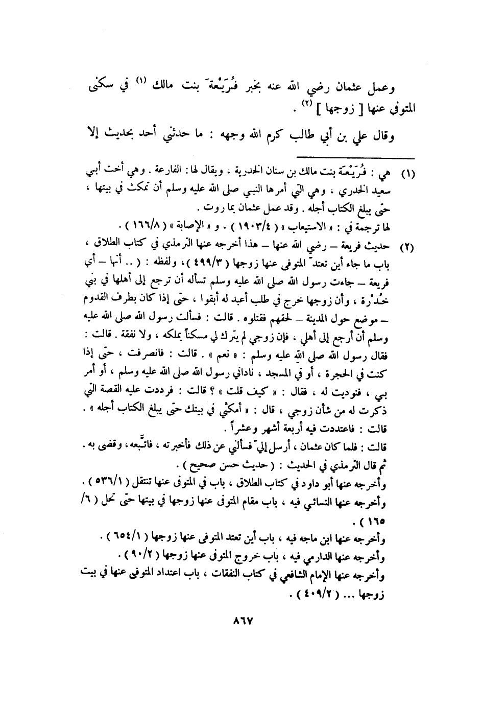 (١) هي: فُرَيْعَة بنت مالك بن سنان الخدرية؟ ويقال لها: الفارعة. وهي أخت أبي سعيد الخدري، وهي التي أمرها النبي صلى الله عليه وسلم أن تمكث في بيتها، حتى يبلغ الكتاب أجله. وقد عمل عثمان بما روت.
