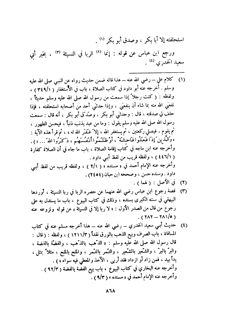 (٣) قصة رجوع ابن عباس رضي الله عنهما عن حصره الربا في ربا النسيئة، أوردها البيهقي في سننه الكبرى بسنده، وذلك في كتاب البيوع، باب ما يستدل به على رجوع من قال من الصدر الأول: "لا ربا إلا في النسيئة" عن قوله ونزوعه عنه (٥/٢٨١-٢٨٢) .