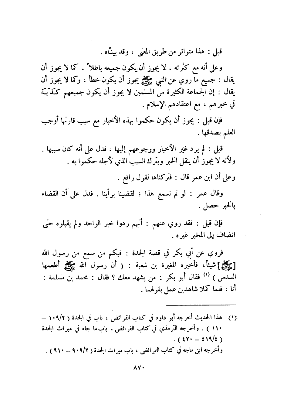 (١) هذا الحديث أخرجه أبو داود في كتاب الفرائض، باب في الجدة (٢/١٠٩-١١٠) . وأخرجه الترمذي في كتاب الفرائض، باب ما جاء في ميراث الجدة (٤/٤١٩-٤٢٠) .