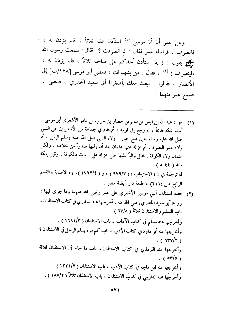 (٢) قصة استئذان أبي موسى الأشعري على عمر رضي الله عنهما وما جرى فيها، رواها أبو سعيد الخدري رضي الله عنه، أخرجها عنه البخاري في كتاب الاستئذان، باب التسليم والاستئذان ثلاثاً (٨/٦٧) .