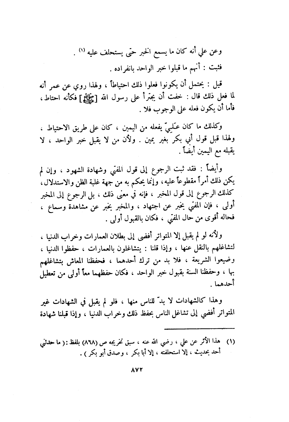 وأيضاً: فقد ثبت الرجوع إلى قول المفتي وشهادة الشهود، وإن لم يكن ذلك أمراً مقطوعاً عليه، وإنما يحكم به من جهة غلبة الظن والاستدلال، كذلك الرجوع إلى قول المخبر، فإنه في معنى ذلك، بل الرجوع إلى المخبر أولى، فإن المفتي يخبر عن اجتهاد، والمخبر يخبر عن مشاهدة وسماع، فحاله أقوى من حال المفتي، فكان بالقبول أولى.