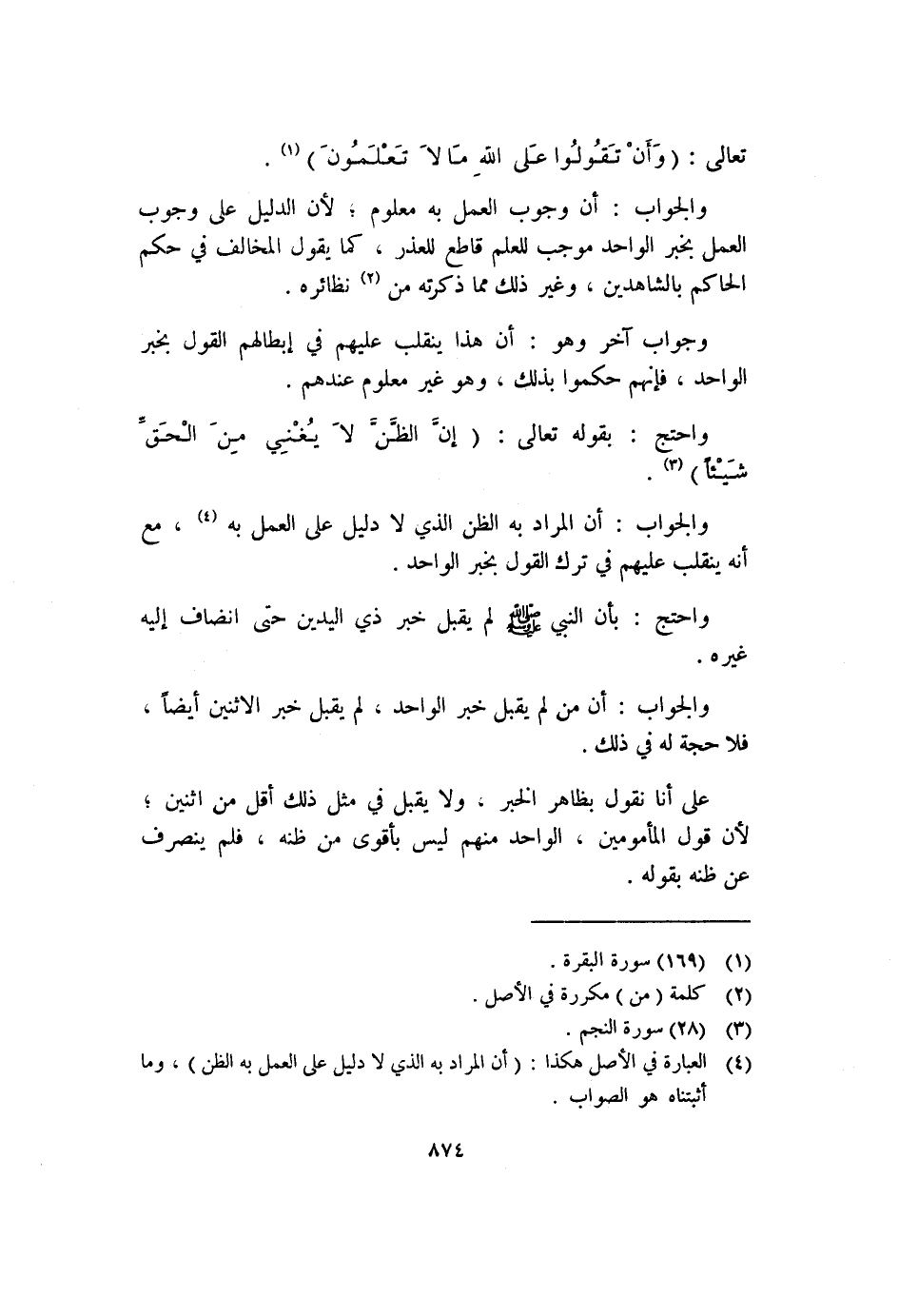 والجواب: أن وجوب العمل به معلوم؛ لأن الدليل على وجوب العمل بخبر الواحد موجب للعلم قاطع للعذر، كما يقول المخالف في حكم الحاكم بالشاهدين، وغير ذلك مما ذكرته من (٢) نظائره.