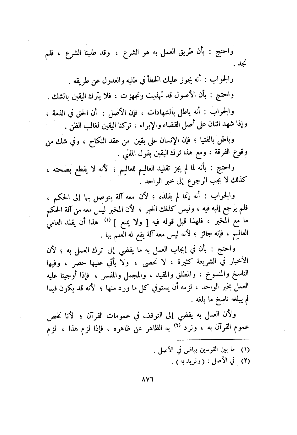 واحتج: بأنه لما لم يجز تقليد العالِم للعالِم؛ لأنه لا يقطع بصحته، كذلك لا يجب الرجوع إلى خبر الواحد.