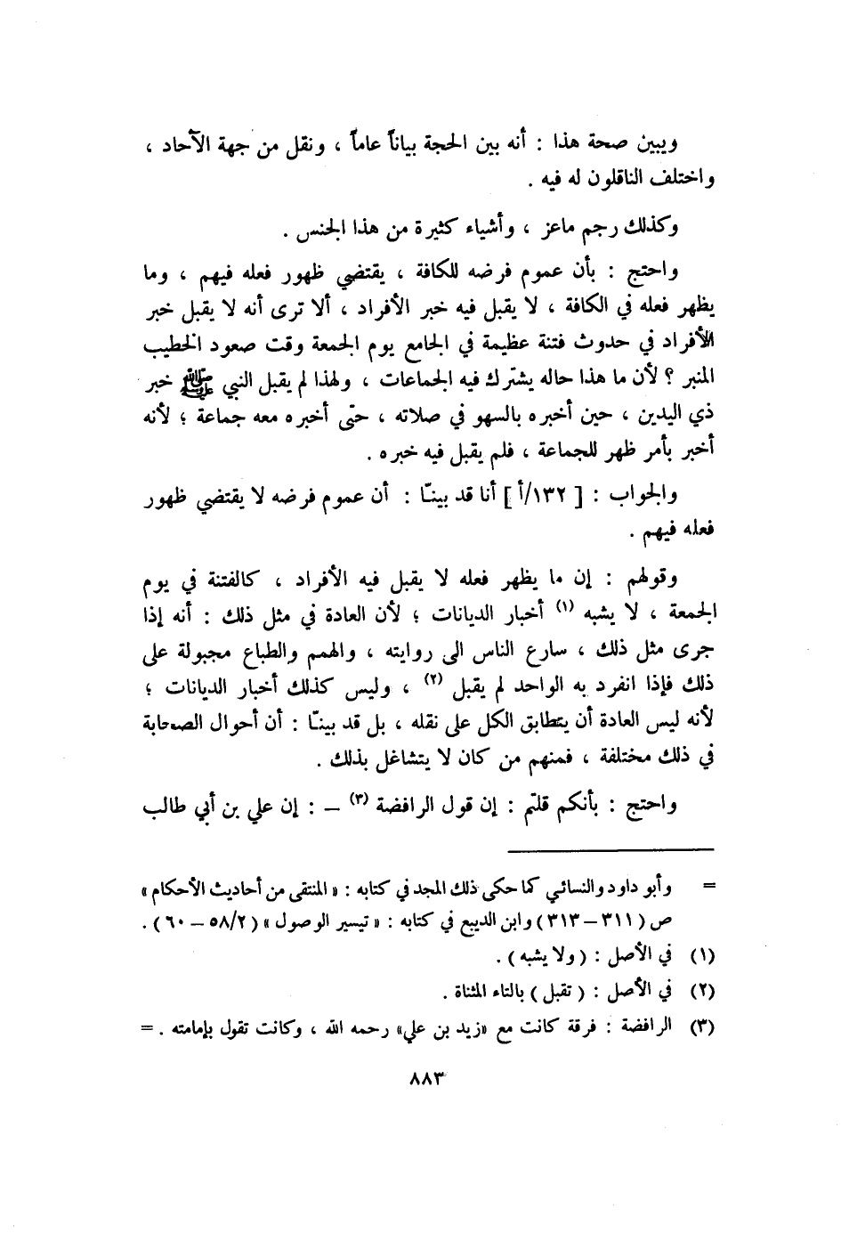 واحتج: بأن عموم فرضه للكافة، يقتضي ظهور فعله فيهم، وما يظهر فعله في الكافة، لا يقبل فيه خبر الأفراد، ألا ترى أنه لا يقبل خبر الأفراد في حدوث فتنة عظيمة في الجامع يوم الجمعة وقت صعود الخطيب المنبر؟ لأن ما هذا حاله يشترك فيه الجماعات، ولهذا لم يقبل النبي - صلى الله عليه وسلم - خبر ذي اليدين، حين أخبره بالسهو في صلاته، حتى أخبره معه جماعة؛ لأنه أخبر بأمر ظهر للجماعة، فلم يقبل فيه خبره.