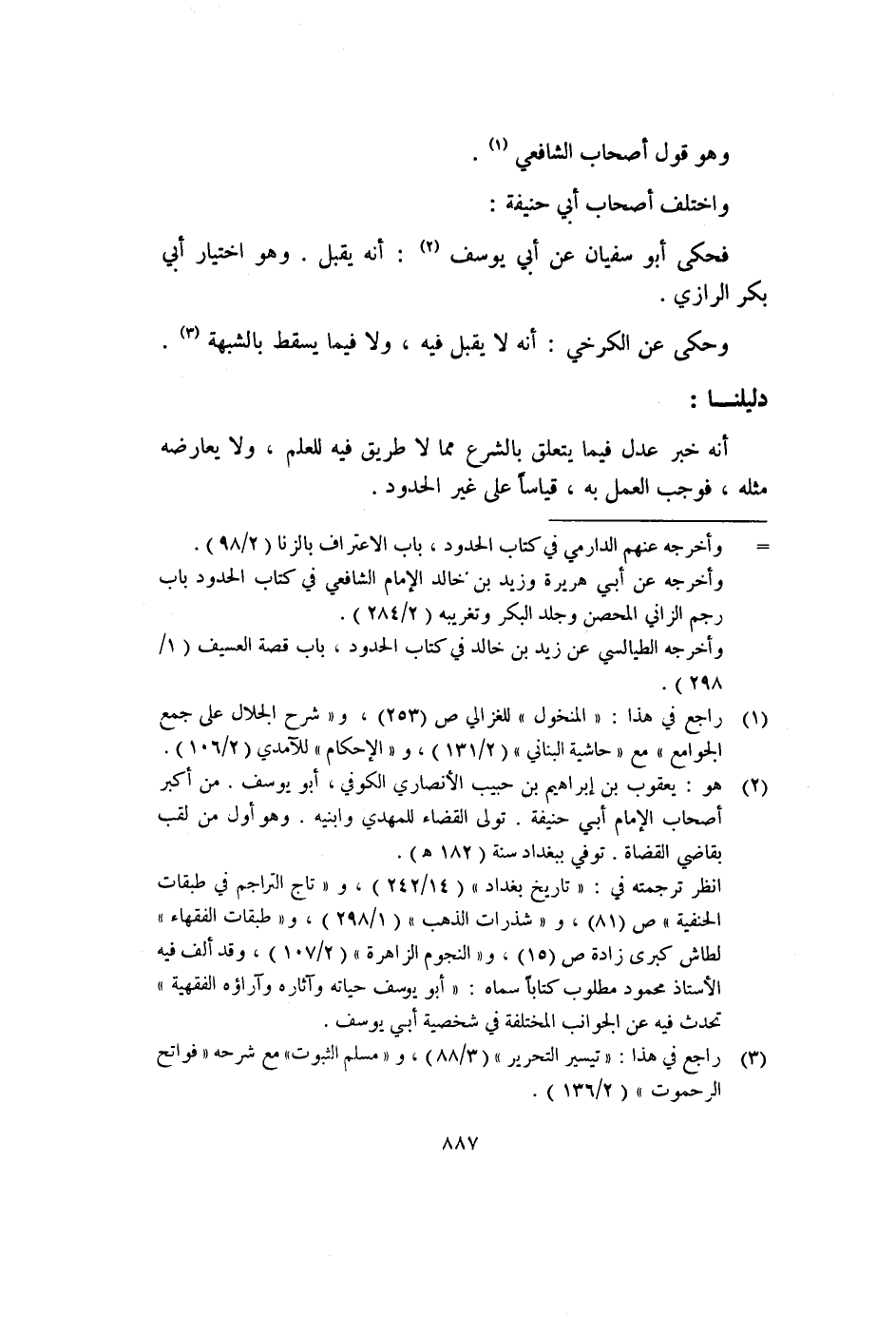 (٢) هو: يعقوب بن إبراهيم بن حبيب الأنصاري الكوفي، أبو يوسف. من أكبر أصحاب الإمام أبي حنيفة. تولى القضاء للمهدي وابنيه. وهو أول من لقب بقاضي القضاة. توفي ببغداد سنة (١٨٢هـ) .