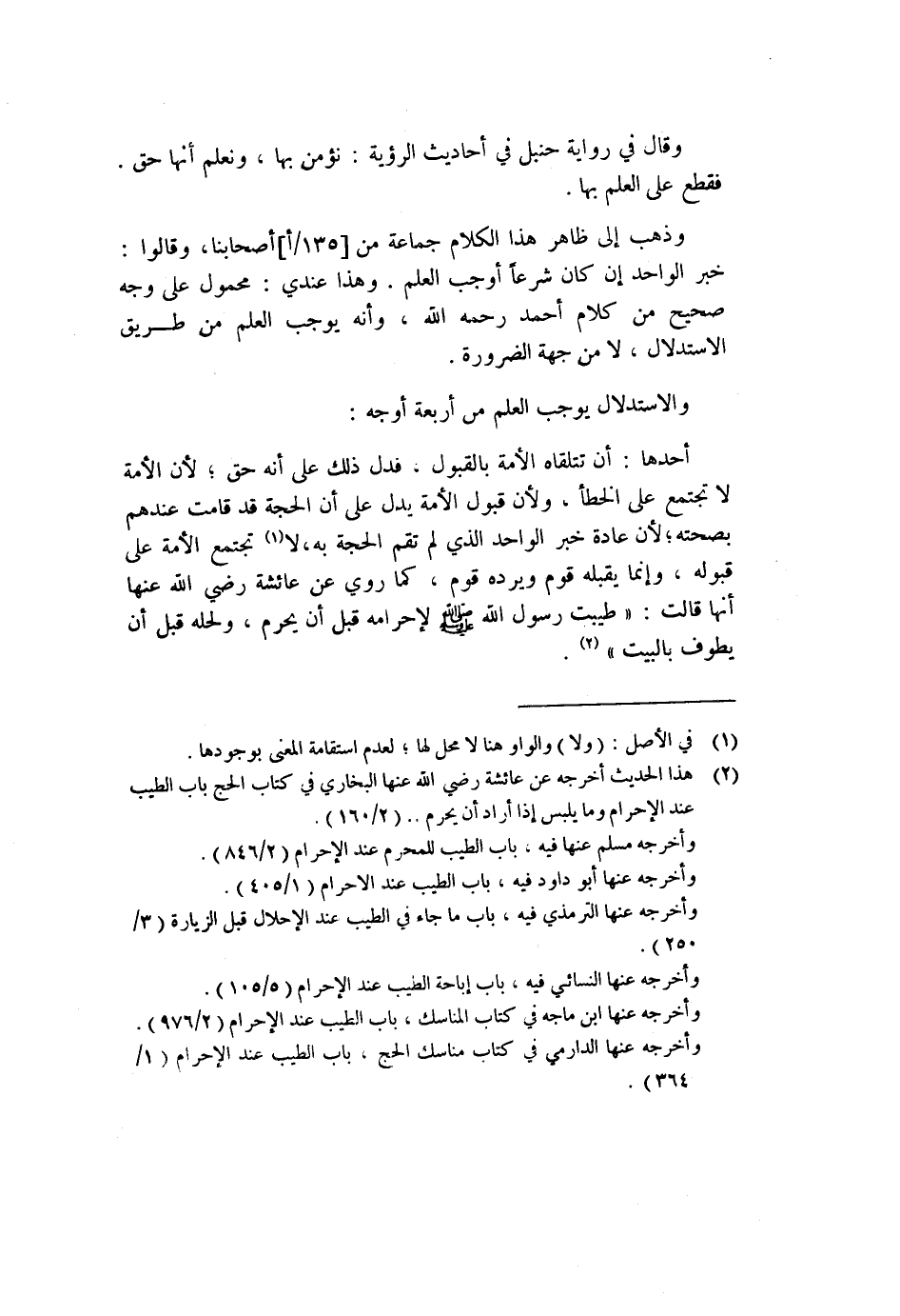 وذهب إلى ظاهر هذا الكلام جماعة من [١٣٥/أ] ، أصحابنا، وقالوا: خبر الواحد إن كان شرعاً أوجب العلم. وهذا عندي: محمول على وجه صحيح من كلام أحمد رحمه الله، وأنه يوجب العلم من طريق الاستدلال، لا من جهة الضرورة.