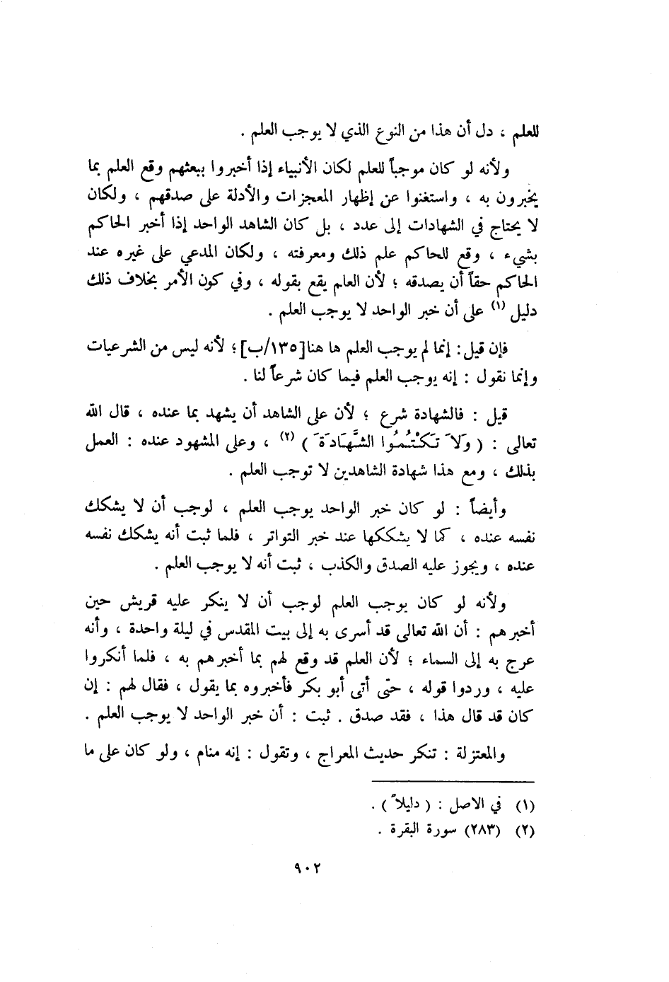 ولأنه لو كان يوجب العلم لوجب أن لا ينكر عليه قريش حين أخبرهم: أن الله تعالى قد أسرى به إلى بيت المقدس في ليلة واحدة، وأنه عرج به إلى السماء؛ لأن العلم قد وقع لهم بما أخبرهم به، فلما أنكروا عليه، وردوا قوله، حتى أتى أبو بكر فأخبروه بما يقول، فقال لهم: إن كان قد قال هذا، فقد صدق. ثبت: أن خبر الواحد لا يوجب العلم.