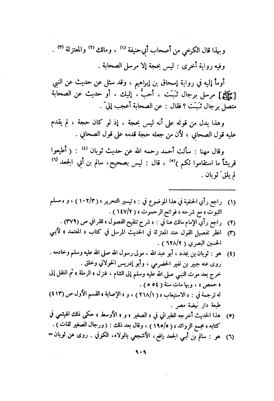 وقال مهنا: سألت أحمد رحمه الله عن حديث ثوبان (٤) : (أطيعوا قريشاً ما استقاموا لكم) (٥) ، قال: ليس بصحيح، سالم بن أبي الجعد (٦) لم يلقَ ثوبان.