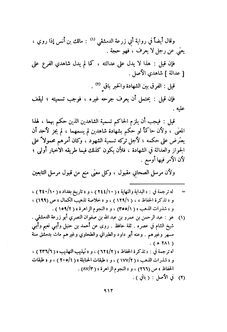 وقال أيضاً في رواية أبي زرعة الدمشقي (١) : مالك بن أنس إذا روي، يعني عن رجل لا يعرف، فهو حجة.