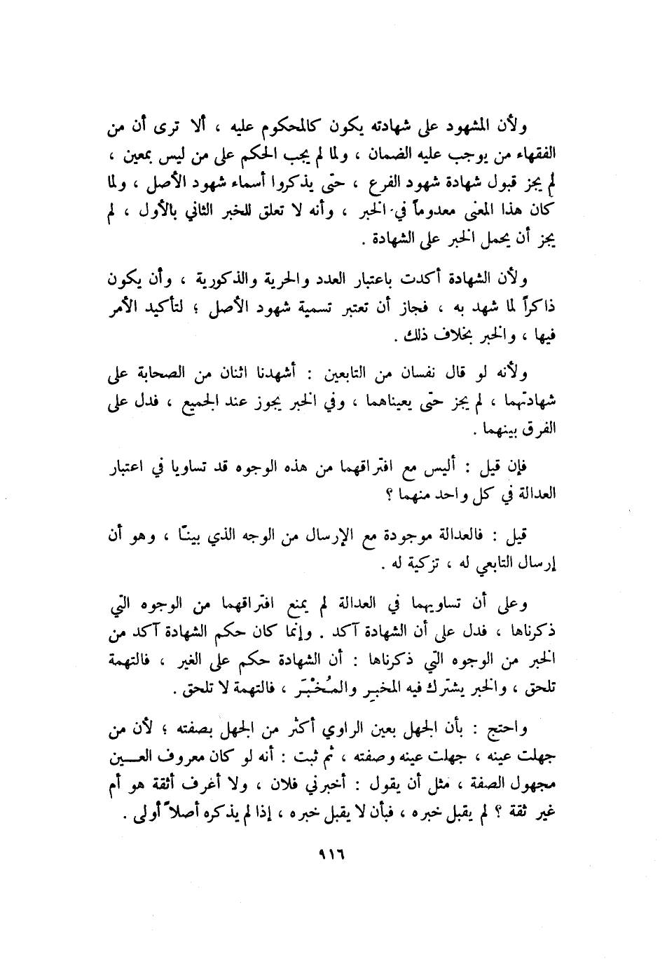وعلى أن تساويهما في العدالة لم يمنع افراقهما من الوجوه التي ذكرناها، فدل على أن الشهادة آكد. وإنما كان حكم الشهادة آكد من الخبر من الوجوه التي ذكرناها: أن الشهادة حكم على الغير، فالتهمة تلحق، والخبر يشترك فيه المخبِر والمُخْبَر، فالتهمه لا تلحق.