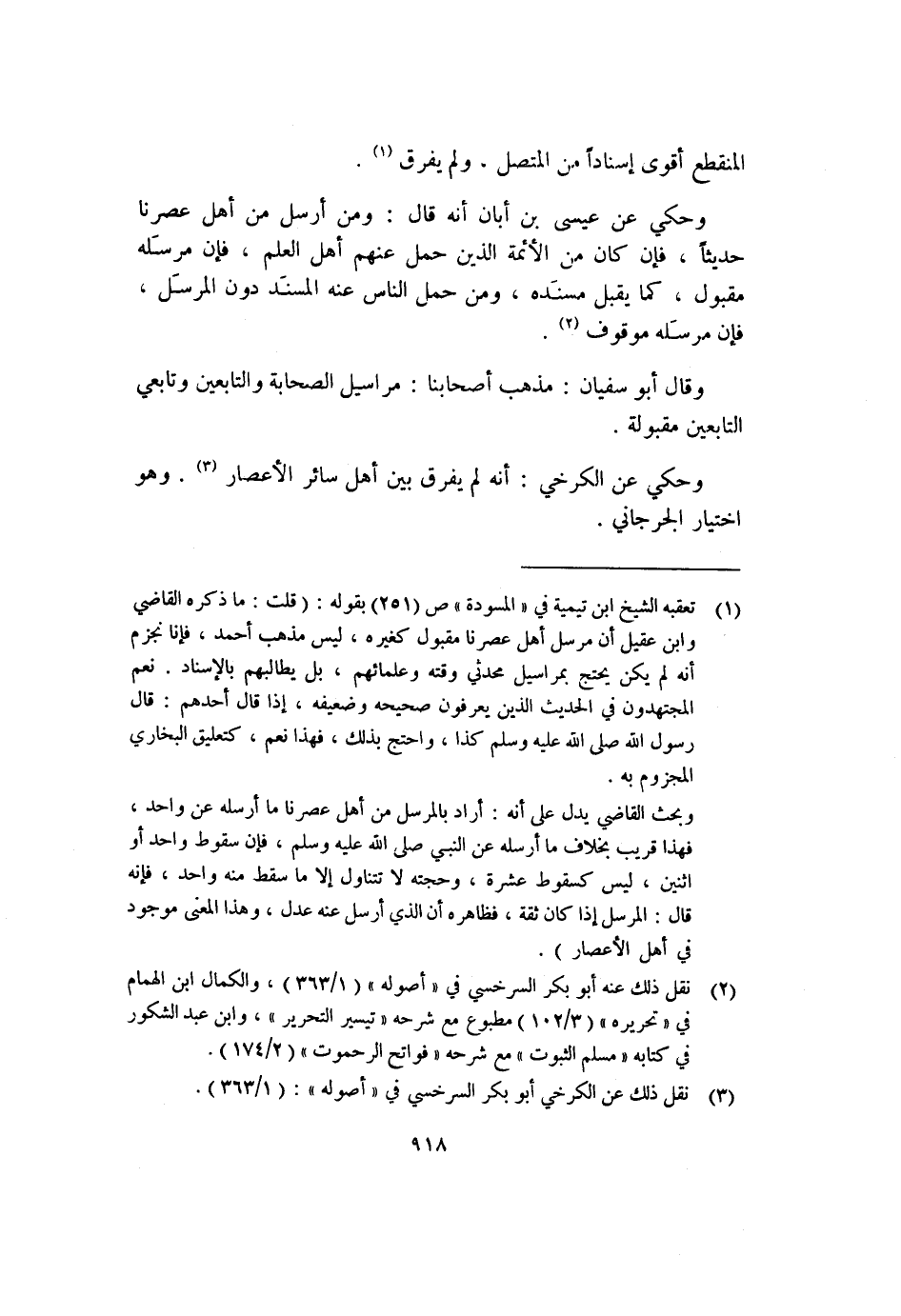 (١) تعقبه الشيخ ابن تيمية في "المسودة" ص (٢٥١) بقوله: (قلت: ما ذكره القاضي وابن عقيل أن مرسل أهل عصرنا مقبول كغيره، ليس مذهب أحمد، فإنا نجزم أنه لم يكن يحتج بمراسيل محدثي وقته وعلمائهم، بل يطالبهم بالإسناد. نعم المجتهدون في الحديث الذين يعرفون صحيحه وضعيفه، إذا قال أحدهم: قال رسول الله صلى الله عليه وسلم كذا، واحتج بذلك، فهذا نعم، كتعليق البخاري المجزوم به.