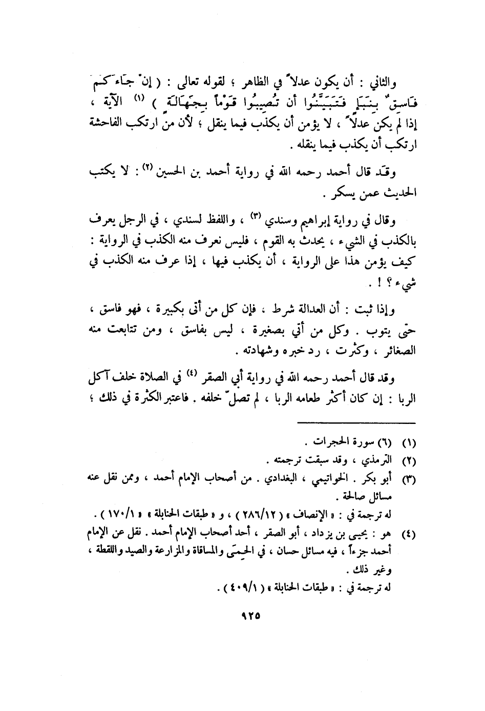 والثاني: أن يكون عدلاً في الظاهر؛ لقوله تعالى: (إنْ جَاءكُمْ فَاسِقٌ بنبَإ فَتَبَينوا أن تُصيبوا قَوْماً بجهَالَة) (١) الآية، إذا لم يكن عدلاً، لا يؤمن أن يكذب فيما ينقل؛ لأن من ارتكب الفاحشة ارتكب أن يكذب فيما ينقله.