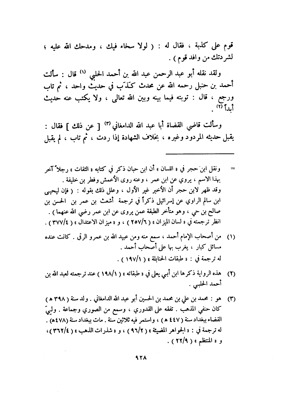 ولقد نقلة له أبو عبد الرحمن عبد الله بن أحمد الحلبي (١) قال: سألت أحمد بن حنبل رحمه الله عن محدث كَذَب في حديث واحد، ثم تاب ورجع، قال: توبته فيما بينه وبين الله تعالى، ولا يكتب عنه حديث أبداً (٢) .