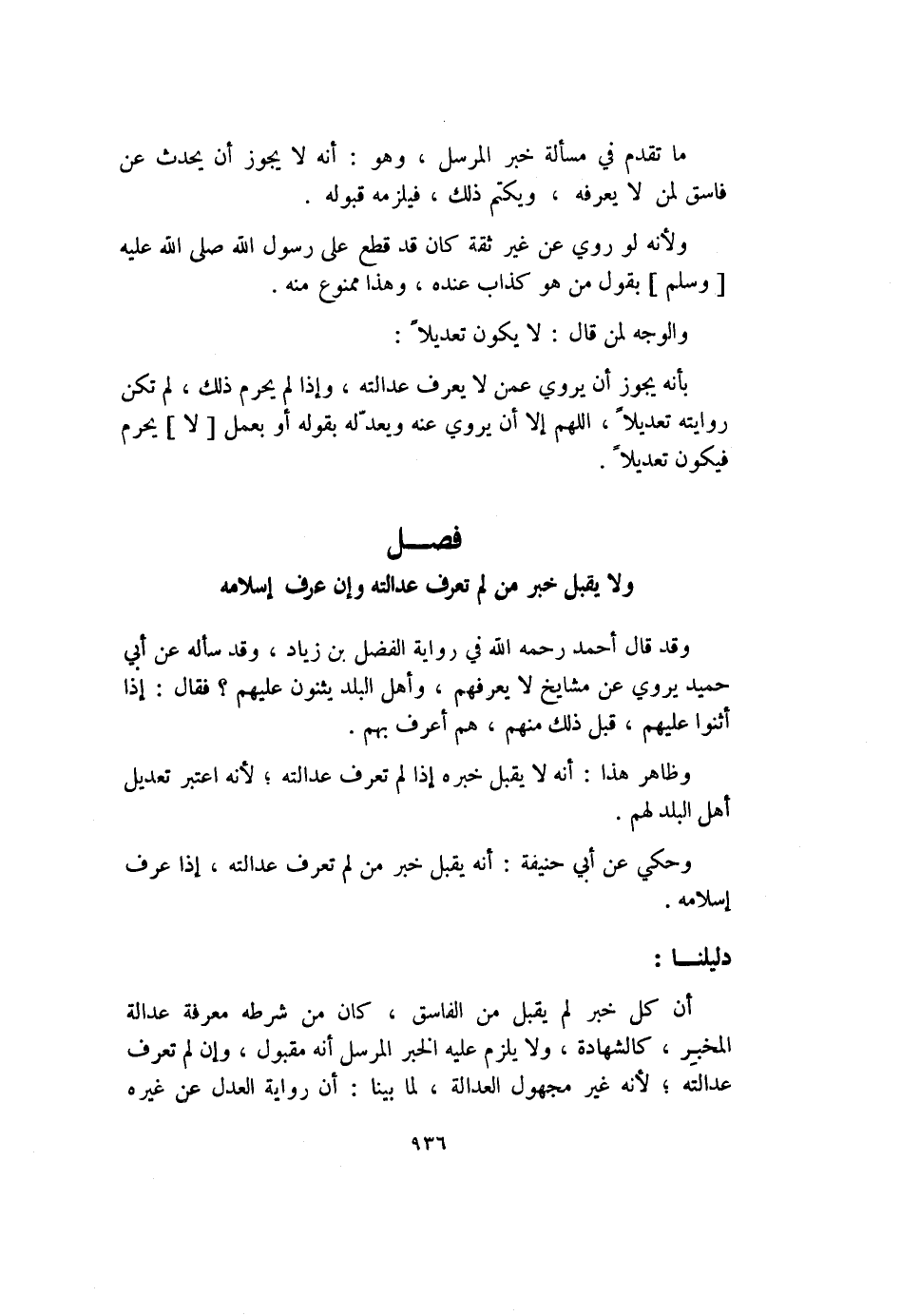ولا يقبل خبر من لم تعرف عدالته وإن عوف إسلامه وقد قال أحمد رحمه الله في رواية الفضل بن زياد، وقد سأله عن أبي حميد يروي عن مشايخ لا يعرفهم، وأهل البلد يثنون عليهم؟ فقال: إذا