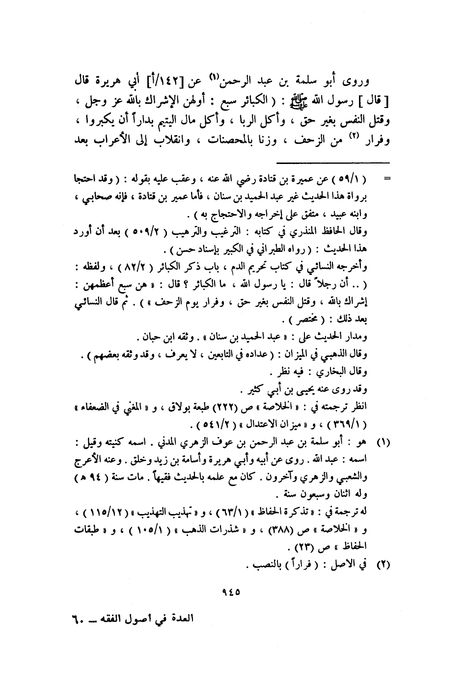وروى أبو سلمة بن عبد الرحمن (١) عن [١٤٢/أ] أبي هريرة قال [قال] رسول الله - صلى الله عليه وسلم -: (الكبائر سبع: أولهن الإشراك بالله عز وجل، وقتل النفس بغير حق، وأكل الربا، وأكل مال اليتيم بداراً أن يكبروا، وفرار (٢) من الزحف، وزنا بالمحصنات، وانقلاب إلى الأعراب بعد