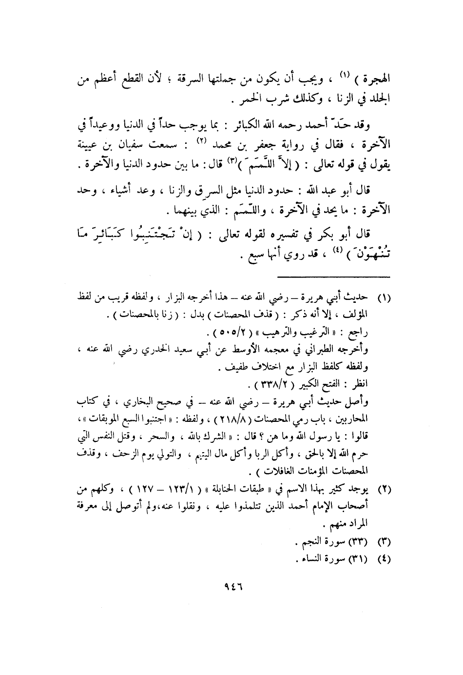 وقد حَدّ أحمد رحمه الله الكبائر: بما يوجب حداً في الدنيا ووعيداً في الآخرة، فقال في رواية جعفر بن محمد (٢) : سمعت سفيان بن عيينة يقول في قوله تعالى: (إلا اللمَمَ) (٣) قال: ما بين حدود الدنيا والآخرة.