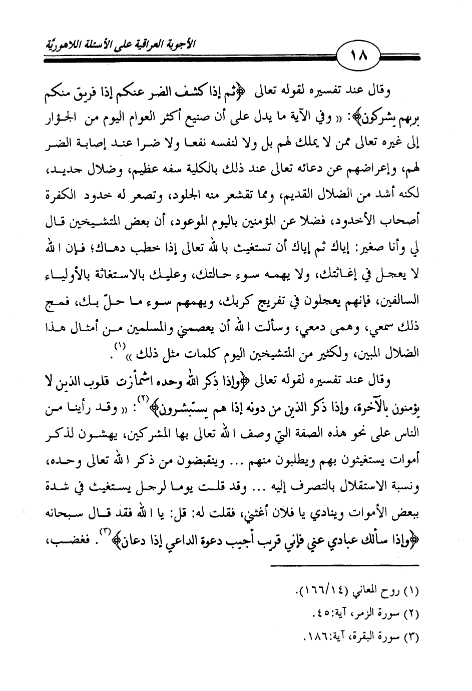بل الواجب عليه بيان حقيقة الحال لمن بين يديه بموجب ما صح: «اذكروا الفاسق بما فيه يحذره الناس» وأجاب بعض الإمامية بأن المراد من فلان رجل من الصحابة مات على عهد رسول الله - صلى الله تعالى عليه وسلم - واختار هذا الراوندي، وهو مما يقضى منه العجب فهل كان يمكن لغيره - عليه الصلاة والسلام - في زمنه الشريف تقويم الأود ومداواة العلل وإقامة السنة، وهل يعقل أن رجلا مات على عهد رسول الله - صلى الله تعالى عليه وسلم - وترك الناس فيما ترك ورسول الله - صلى الله تعالى عليه وسلم - قائم يصدع بالحق ويهدي إلى صراط مستقيم. هذا لعمري الخرق العظيم والخطب الجسيم. وأجاب بعض آخر منهم بأن الغرض من هذا الكلام مجرد التعريض بذم عثمان - رضي الله تعالى عنه - وهو أيضا مما يتعجب منه لأن التعريض كان ممكنا بدون ارتكاب هذا الأسلوب. وأيضا ما الداعي للتعريض دون التصريح وهو في الكوفة بين شيعته وأنصاره.