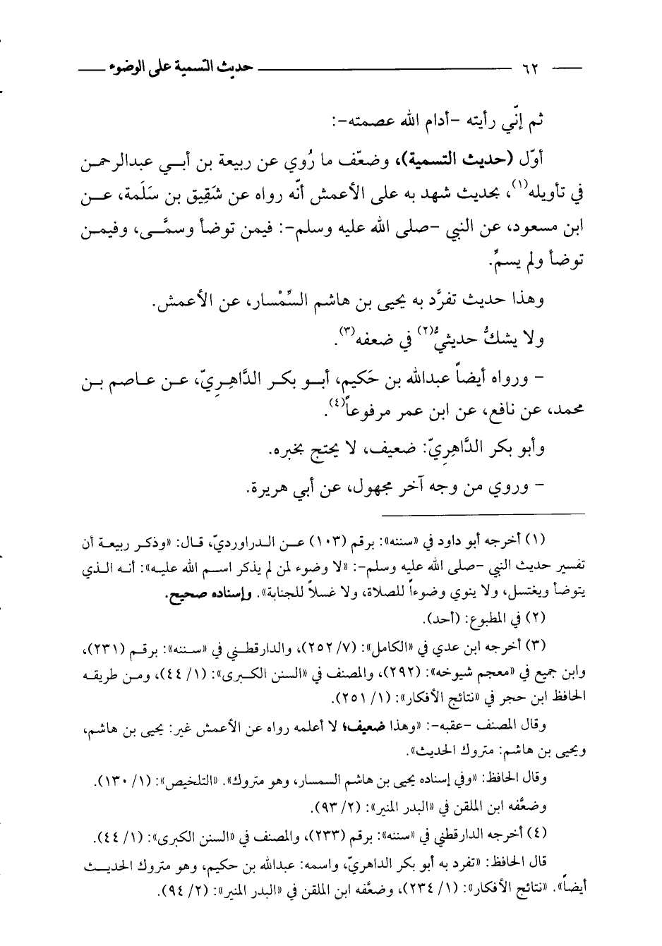 ثم إني رأيته -أدام الله عصمته-: أوَّل (حديث التسمية) ، وضعف ما روي عن ربيعة بن أبي عبد الرحمن في تأويله، بحديث شهد به على الأعمش أنه رواه عن شقيق بن سلمة، عن ابن مسعود، عن النبي - صلى الله عليه وسلم -: فيمن توضأ وسمى، وفيمن توضأ ولم يسم.