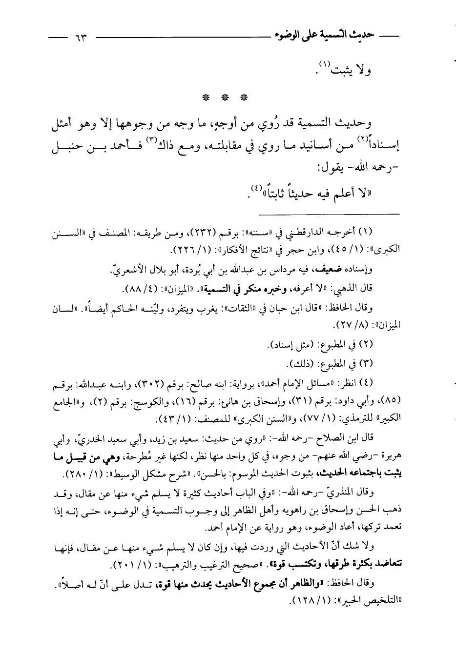 وحديث التسمية قد روي من أوجهٍ، ما وجه من وجوهها إلا وهو أمثل إسناداً من أسانيد ما روي في مقابلته، ومع ذاك فأحمد بن حنبل -رحمه الله- يقول: