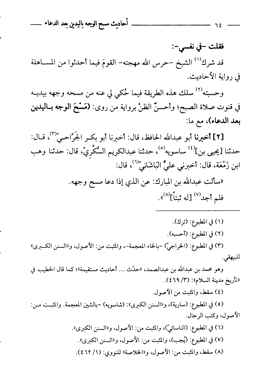 وحسبته سلك هذه الطريقة فيما حكي لي عنه من مسحه وجهه بيديه في قنوت صلاة الصبح؛ وأحسن الظن برواية من روى: (مسح الوجه باليدين بعد الدعاء) ، مع ما: