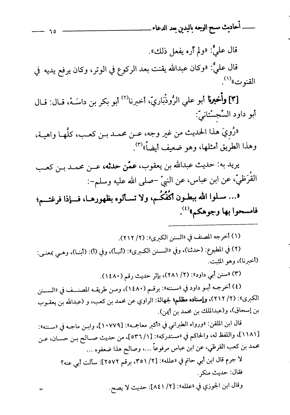 ((.. .. سلوا الله ببطون أكفكم، ولا تسألوه بظهورها، فإذا فرغتم؛ فامسحوا بها وجوهكم)) .