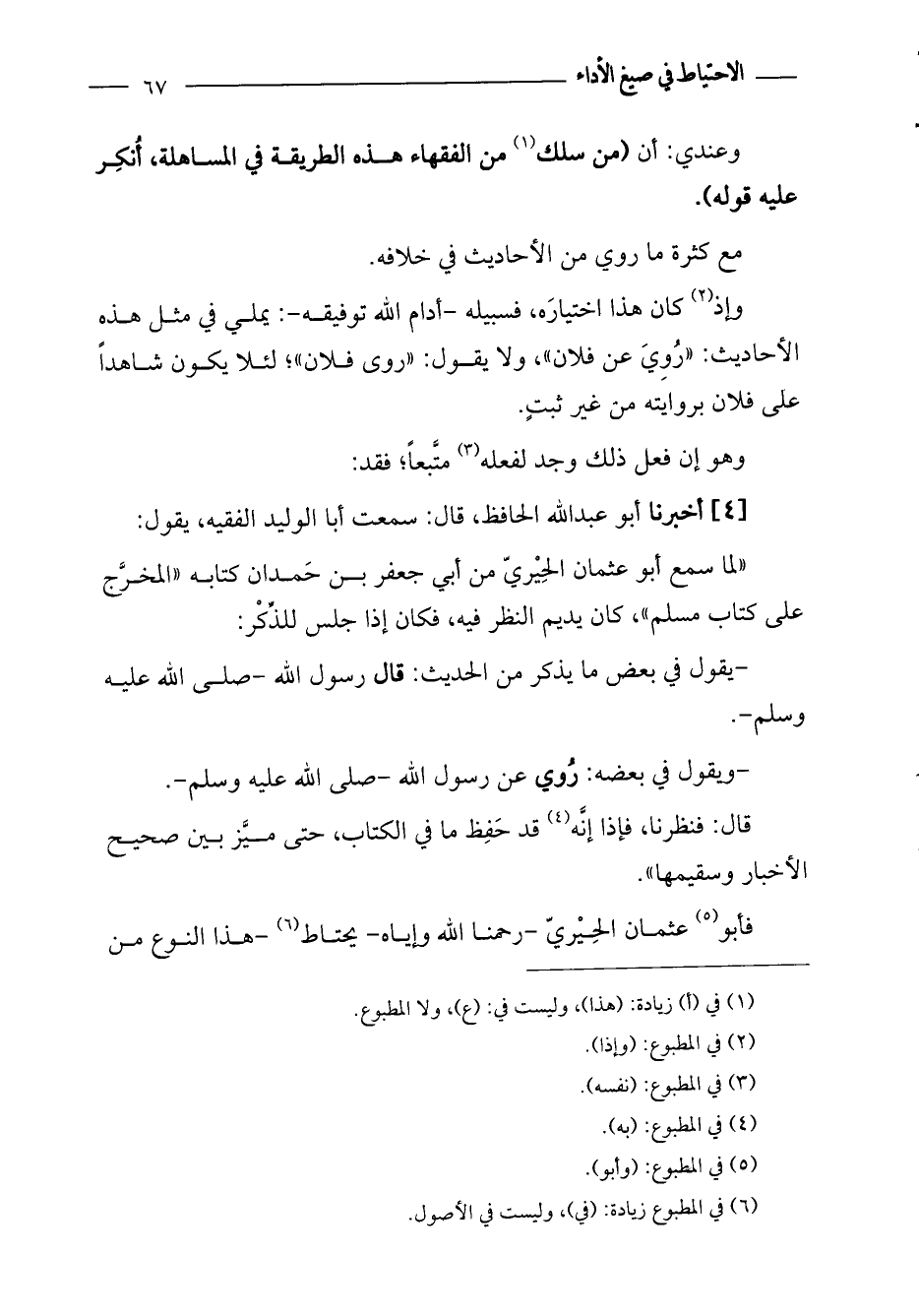 وإذ كان هذا اختياره، فسبيله -أدام الله توفيقه-: يملي في مثل هذه الأحاديث: ((روي عن فلان، ولا يقول: ((روى فلان)) ؛ لئلا يكون شاهداً على فلان بروايته من غير ثبتٍ.