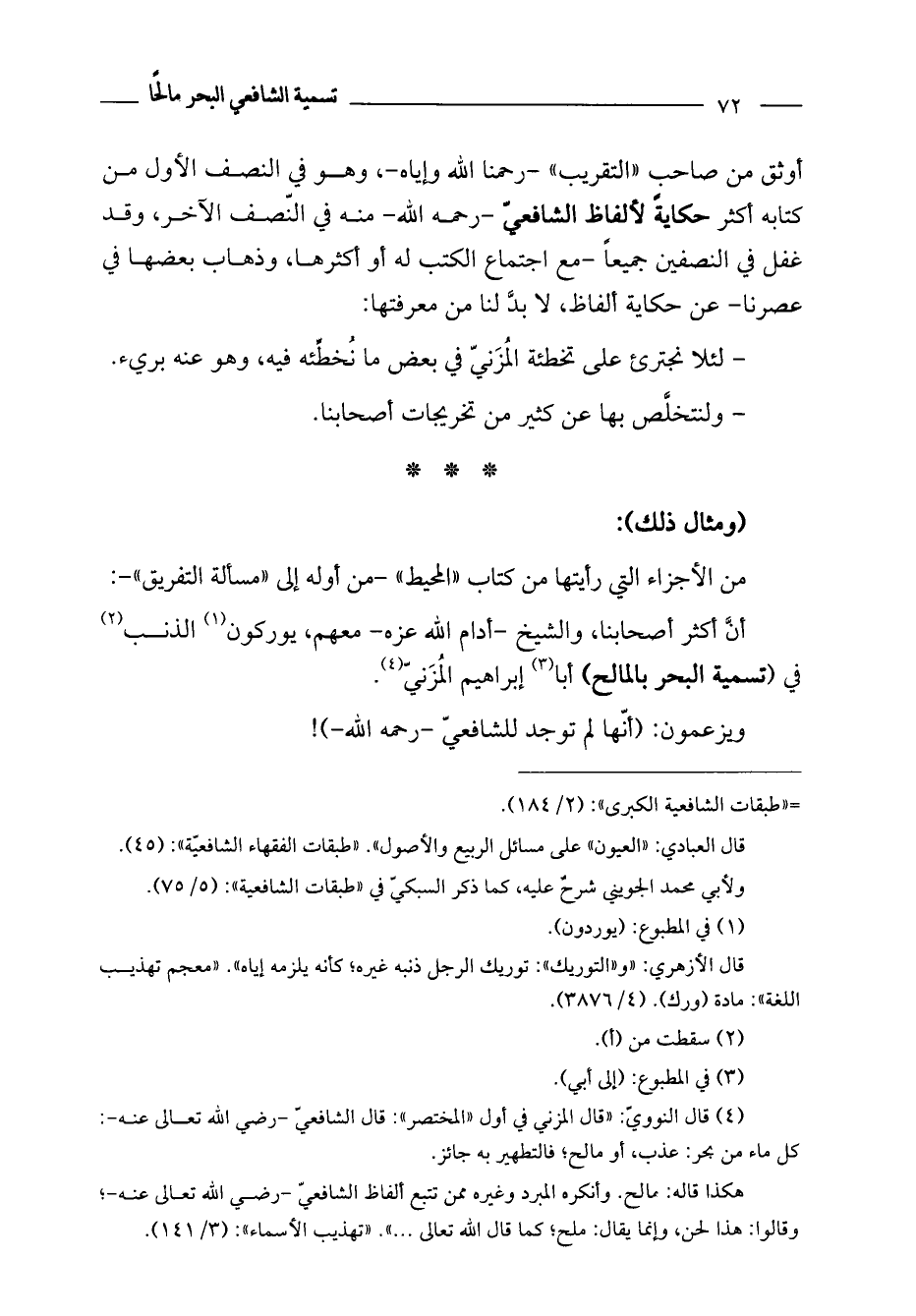 أن أكثر أصحابنا، والشيخ -أدام الله عزه- معهم، يوركون الذنب (في تسمية البحر بالمالح) أبا إبراهيم المزني.
