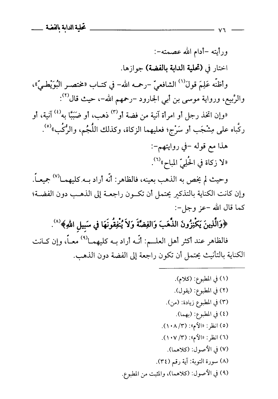 ورأيته -أدام الله عصمته-: اختار في (تحلية الدابة بالفضة) جوازها.