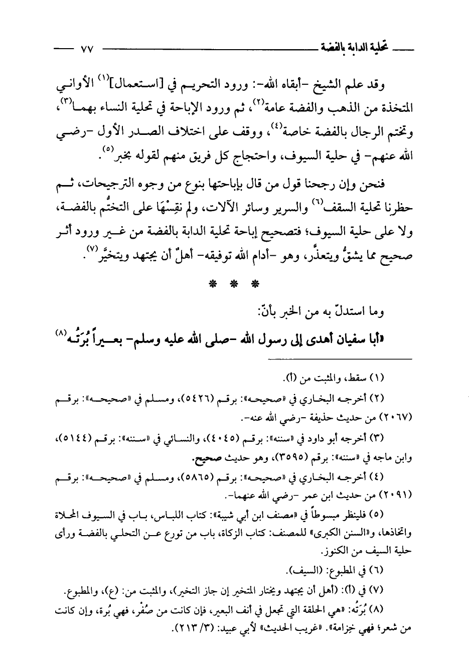 وقد علم الشيخ -أبقاه الله-: ورود التحريم في [استعمال] الأواني المتخذة من الذهب والفضة عامة، ثم ورود الإباحة في تحلية النساء بهما، وتختم الرجال بالفضة خاصة، ووقف على اختلاف الصدر الأول -رضي الله عنهم- في حلية السيوف، واحتجاج كل فريق منهم لقوله بخبر.